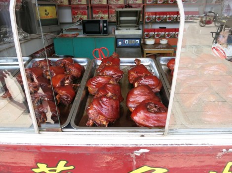 I spotted many shops displaying these red braised WanShan style pork knuckles in various sizes. They also sold vacuum sealed ready to eat packs, which scared me a little but I still ended up buying a small one to try later. It was a bit salty and coated with a sticky sweet glaze, but the meat was very tender. The tour guide said the recipe came about accidentally many centuries ago when a knuckle was left braising in the pot long after the fire had diminished.