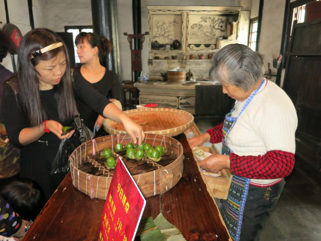 A lady in the museum selling Qingtuan, green sticky rice flour cakes filled with sweet red bean paste and eaten during the Qingming festival.