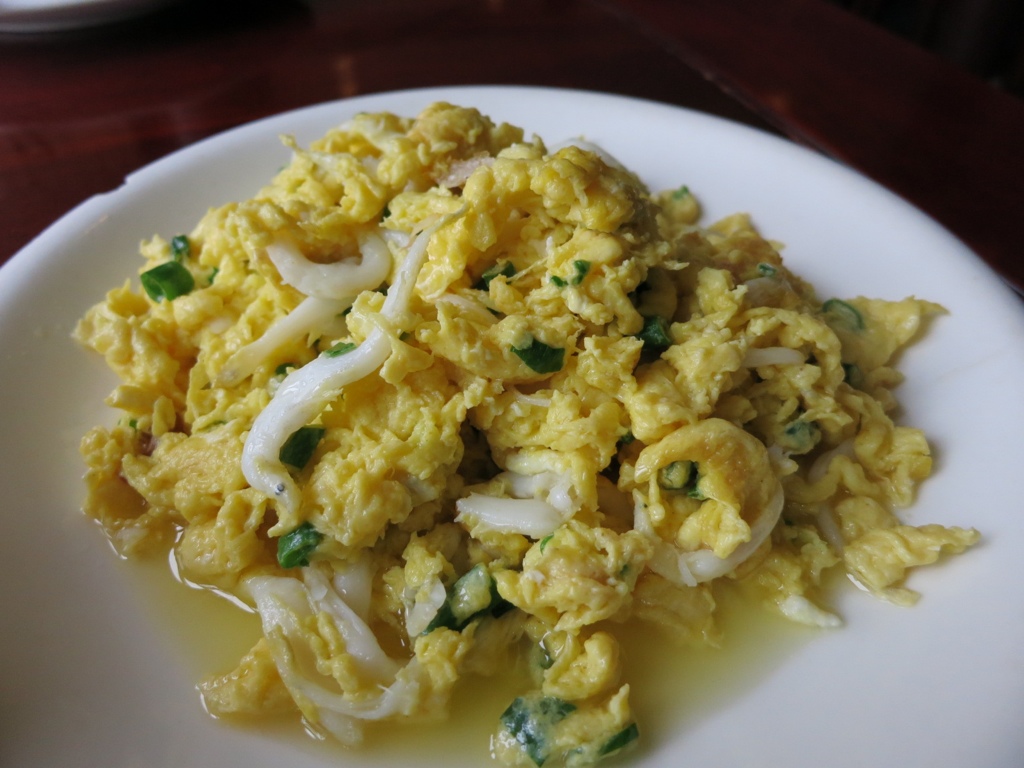 At first glance, I thought it was pieces of flaky white fish in the eggs…until I spotted the little black eyes.