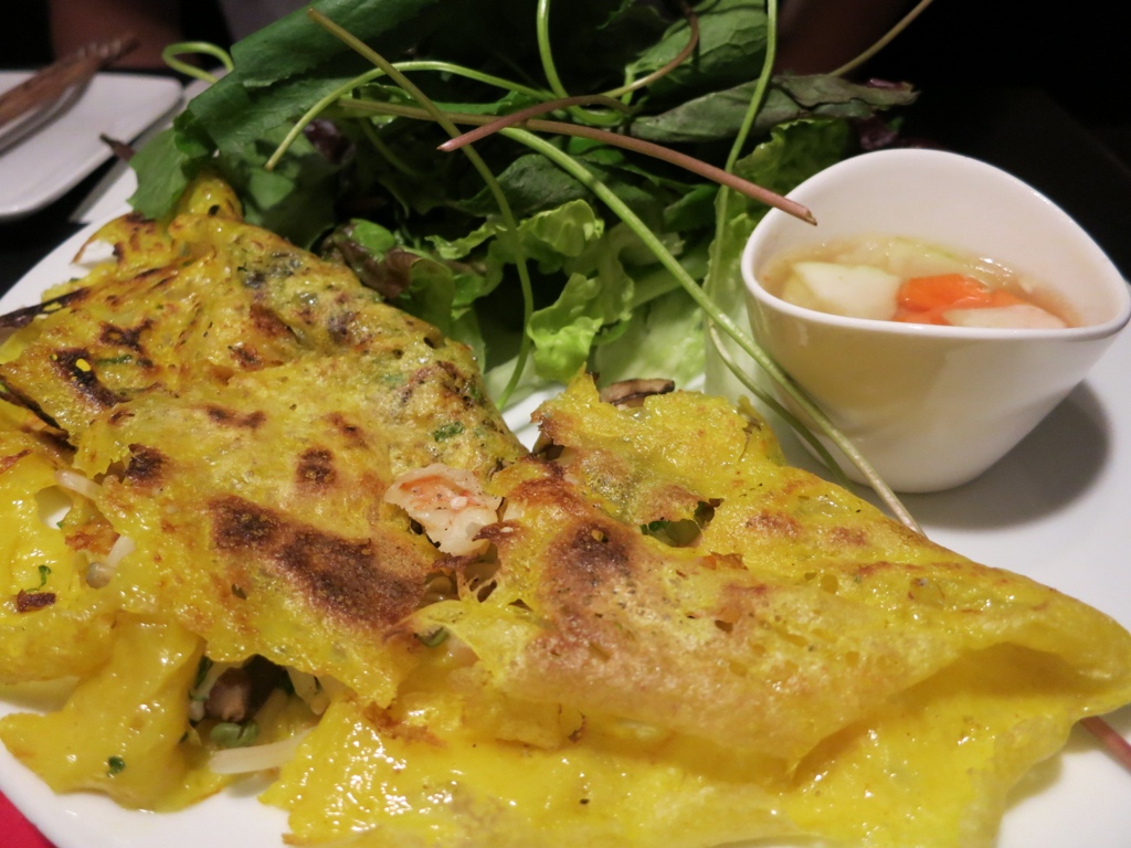 We also ordered their shrimp banh xeo (sizzling cakes on the menu), delicate thin egg crepes served with various herbs, pickled carrots and radish in nuoc cham. We both really liked it and thought it was lighter and fresher than most places.