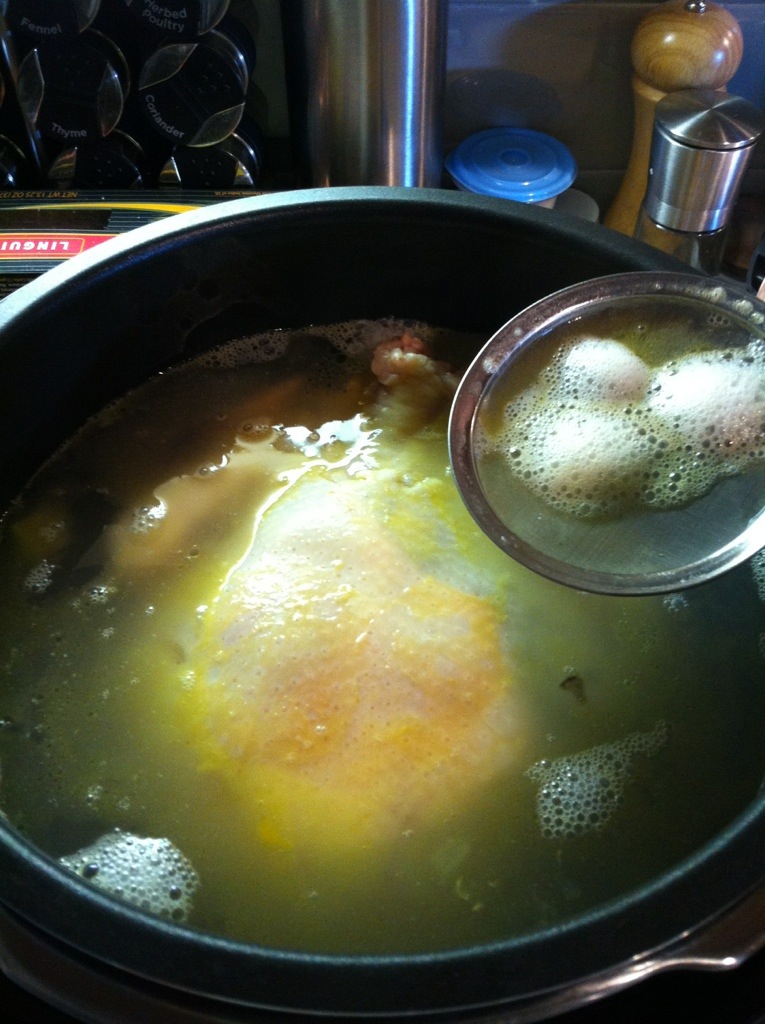 Then I placed a whole chicken in (giblets removed) and filled the pot up slightly lower than the max line with water. I let it come to boil again on the saute/sear function for about 6 minutes and skimmed off any scum from the surface.