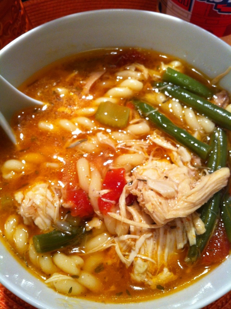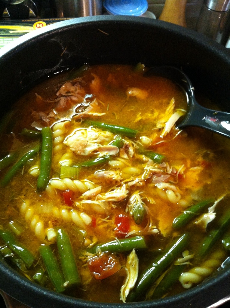 I dumped in the can of stewed tomatoes, my herbs, and a few dashes of Worcestershire sauce. Placed the lid on and pressure cooked chicken on medium for 25 minutes. After it was done, I removed the chicken and shredded the meat, discarding the skin and bones. The meat was placed back in the pot and the uncooked pasta and green beans added in with salt and pepper. Another 6 minutes of pressure cooking on low and the hearty soup was done. This all took about an hour.