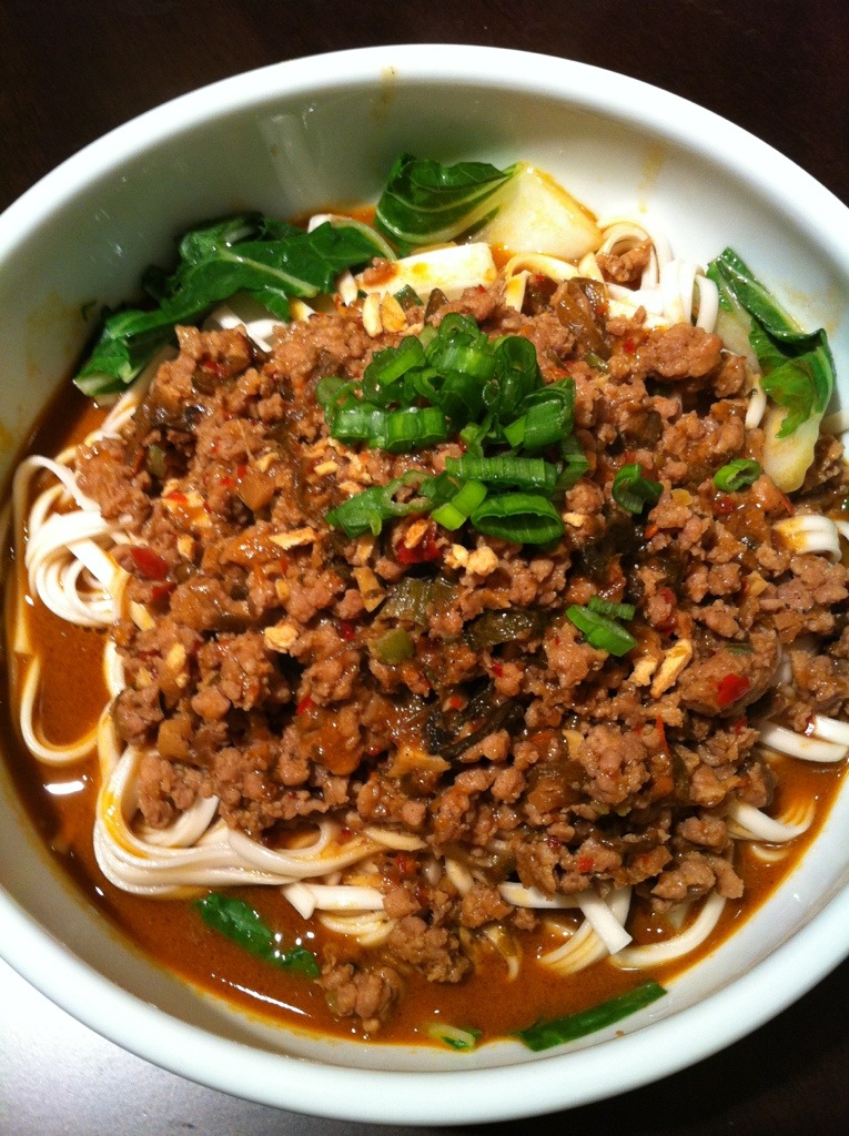 A few years back I posted a super simple recipe for zha jiang mian. I was in the mood for something spicier tonight and since it was already 8:30 pm and the hubby was hungry after flag football, whatever I made had to be quick and filling. I remembered that there was a new jar of toasted sesame paste sitting in my pantry so all we had to do was run to the store to pick up some bok choy and 30 minutes later, we were slurping down two bowls of hot and spicy dan dan noodles.